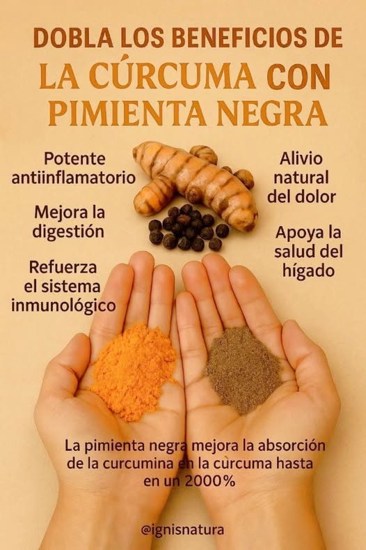 La cúrcuma, reconocida por siglos en la medicina ayurvédica, es uno de los antiinflamatorios naturales más potentes que existen. Sin embargo, su principal compuesto activo, la curcumina, tiene una baja biodisponibilidad, lo que significa que el cuerpo humano la absorbe con dificultad. Pero aquí entra en juego la magia: al combinarla con pimienta negra, sus beneficios se multiplican.