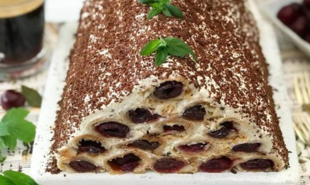 Pastel de crema agria "Cabaña monástica" con cerezas