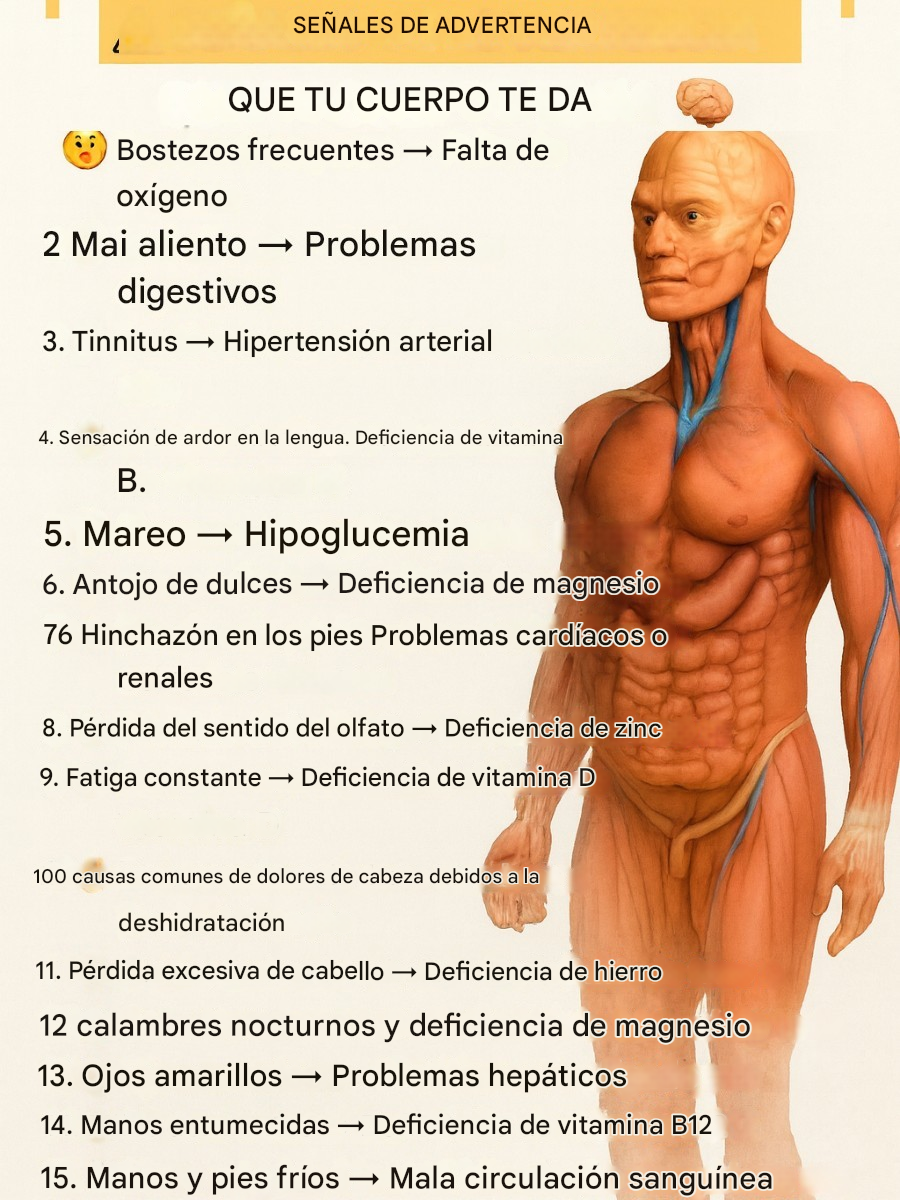 Imagina tu cuerpo como un mensajero silencioso que envía alertas urgentes a través de síntomas cotidianos que ignoras. Ese bostezo interminable, el zumbido en los oídos o las manos frías no son coincidencias: son señales de alarma que indican graves deficiencias nutricionales, problemas digestivos o riesgos cardíacos inminentes. Descubre estas 15 señales de advertencia de que tu cuerpo te pide ayuda antes de que sea demasiado tarde. Este conocimiento no solo te empodera, sino que transforma tu rutina diaria en una estrategia de salud infalible, manteniéndote vital y protegido.